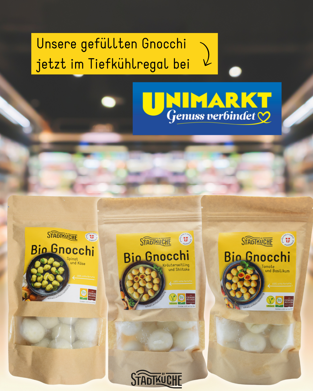 Seit kurzem findest du unsere gefüllten Gnocchi in allen Unimarkt Filialen in Österreich. Regionaler Handel trifft auf 100% Bio-Lebensmittelhandwerk und Regionalität aus Österreich. Damit helfen wir euch dabei euer Teller mit schnellem, einfachem und trotzdem richtig gutem Essen zu füllen. Schmeckt wie selbst gekocht, geht nur viel schneller ☺️
