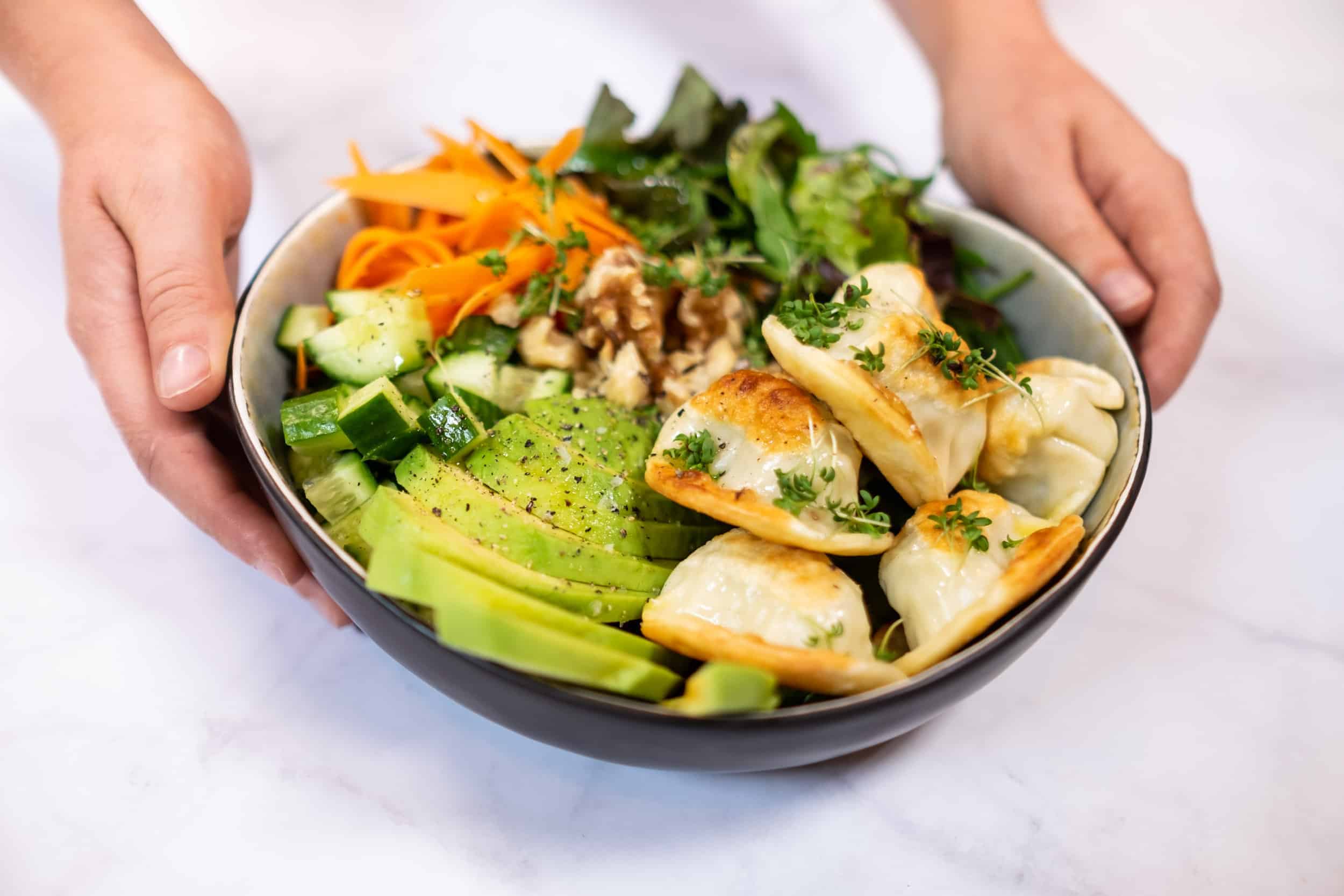 Unsere Salat Bowl mit Ziegenkäse-Nudl kann je nach Gusto auch mit anderen Kasnudl gemacht. Wir lieben auch die Parmesan-Nudl in dieser Kreation 🙂